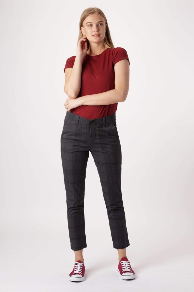 Super flotte og bløde ternede bukser fra Bessie Jeans. De er i 7/8 længde, er i en flot tern i lysbrun, grå og mørkebrune nuancer. Perfekt til efteråret og vinter. Lynlås og en enkelt knap lukning. De har lommer i siden og baglommer. Normal pasform.