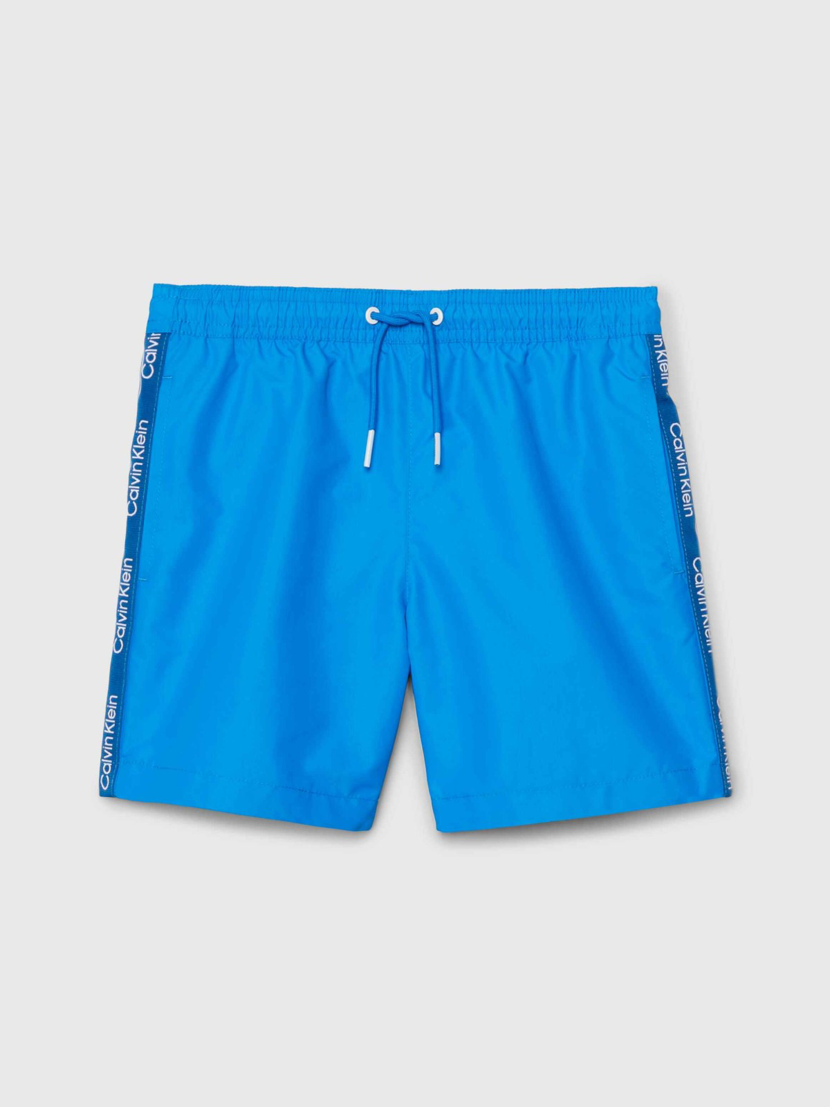 Super cool Calvin Klein badeshorts i sort eller blå. De har et stort "cK" og "one" printet i hvid fortil, på venstre lår. Badeshortsene har en bred elastikkant i taljen, med justerbare bindesnore i hvid foran. Foran er der to store, åbne lommer i siderne, og bagpå er der en lomme i højre side, som åbnes med velcro. Indvendigt er der et meshnet.