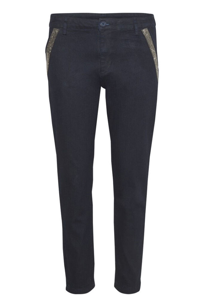 Klassisk pæn 7/8 buks fra Culture. De har et slim/ regulart fit og en almindelig talje. Fast linning foran og elastik i livet bagpå. Skrålommer og paspolerede baglommer. * 50% Bomuld * 46% Polyester * 4% Elastan