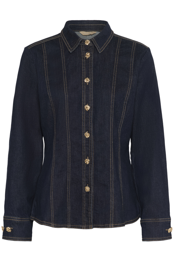 Flot klassisk skjorte fra Culture med fine detaljer. Den har krave med sspidse flipper, smukke perlemors agtige knapper, manchet på ærmet . Indeni nakken er en sød blondekant. Skjorten har lidt længde og er derfor flot at bruge under dine strik.
