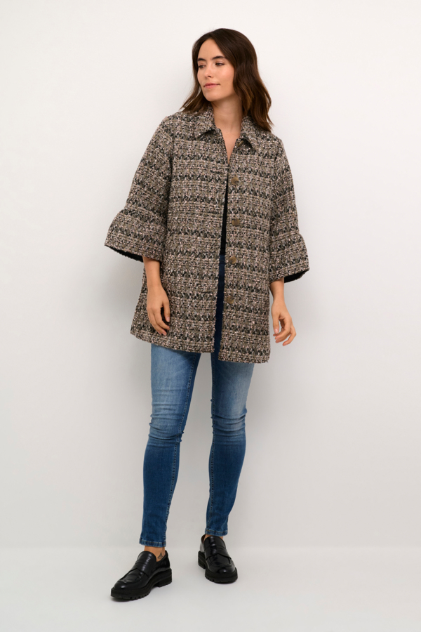 Culture står bag denne fine i klokkefacon. Jakken har en kort længde og 3/4 lange ærmer med en flot bred blæsekant. De er skjulte trykknakker foran, stiklommer og en flot krave.