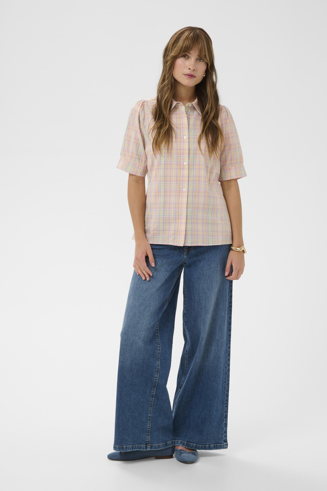 Culture har designet denne søde og feminini skjorte. Skjorten har flotte lyse striber, høj slids i siden samt en flot rose som sidder på et bånd i halsen. Rosen kan tages af og evt bruges i håret eller som bælte.