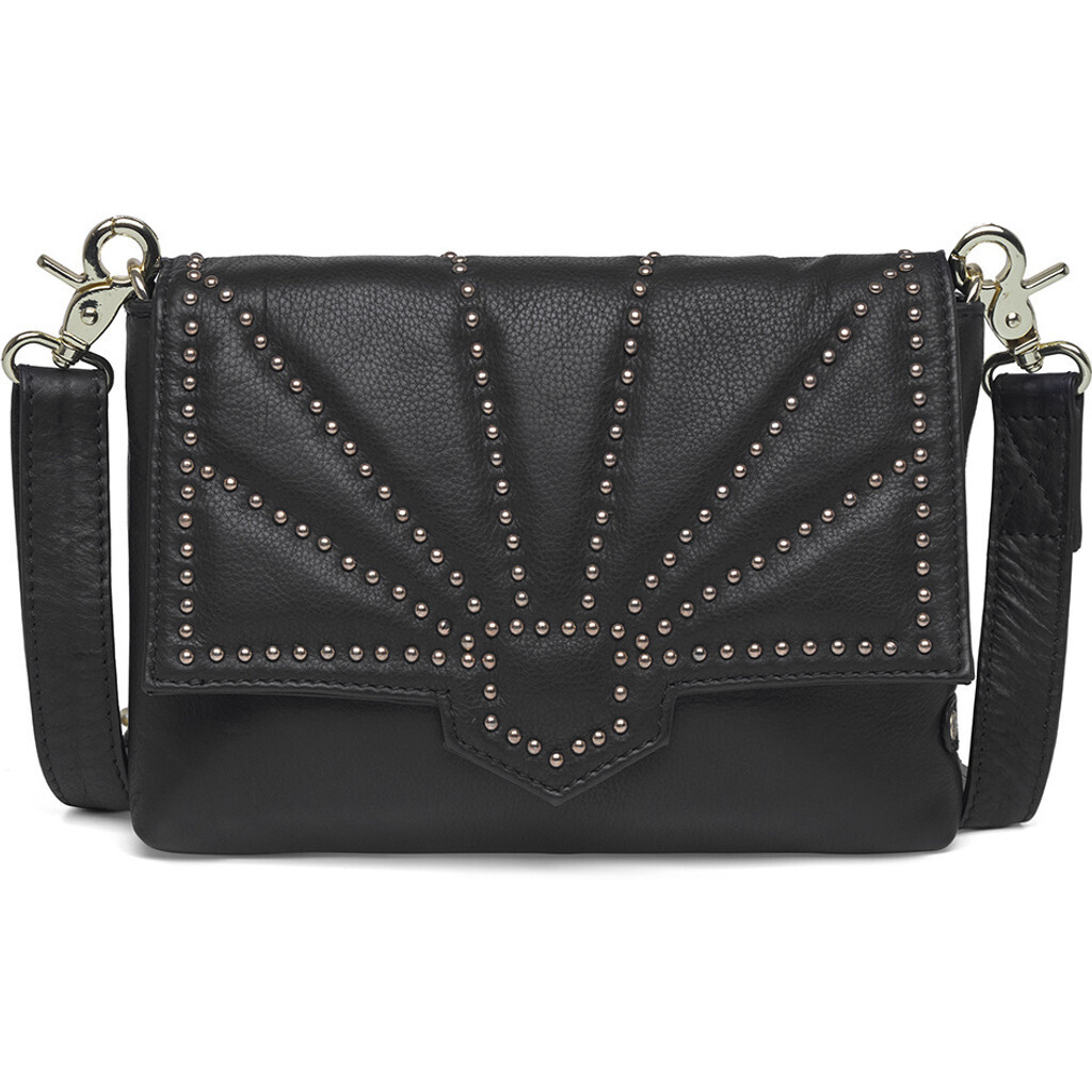 Eksklusiv Depeche clutch-/crossover-taske, der er fremstillet i blødt skind af høj kvalitet. Den er udsmykket med smukt guld broderi med sorte stikninger rundt i kanten. Tasken lukkes med lynlås og der er skulderrem med dertil. Indeni er den opdelt 2 rum med lynlås lomme i det ene og 2 åbne lommer i det andet. God plads til nøgler, mobil og ander fornødenheder. H: 25 x W: 18 x D: 5 cm