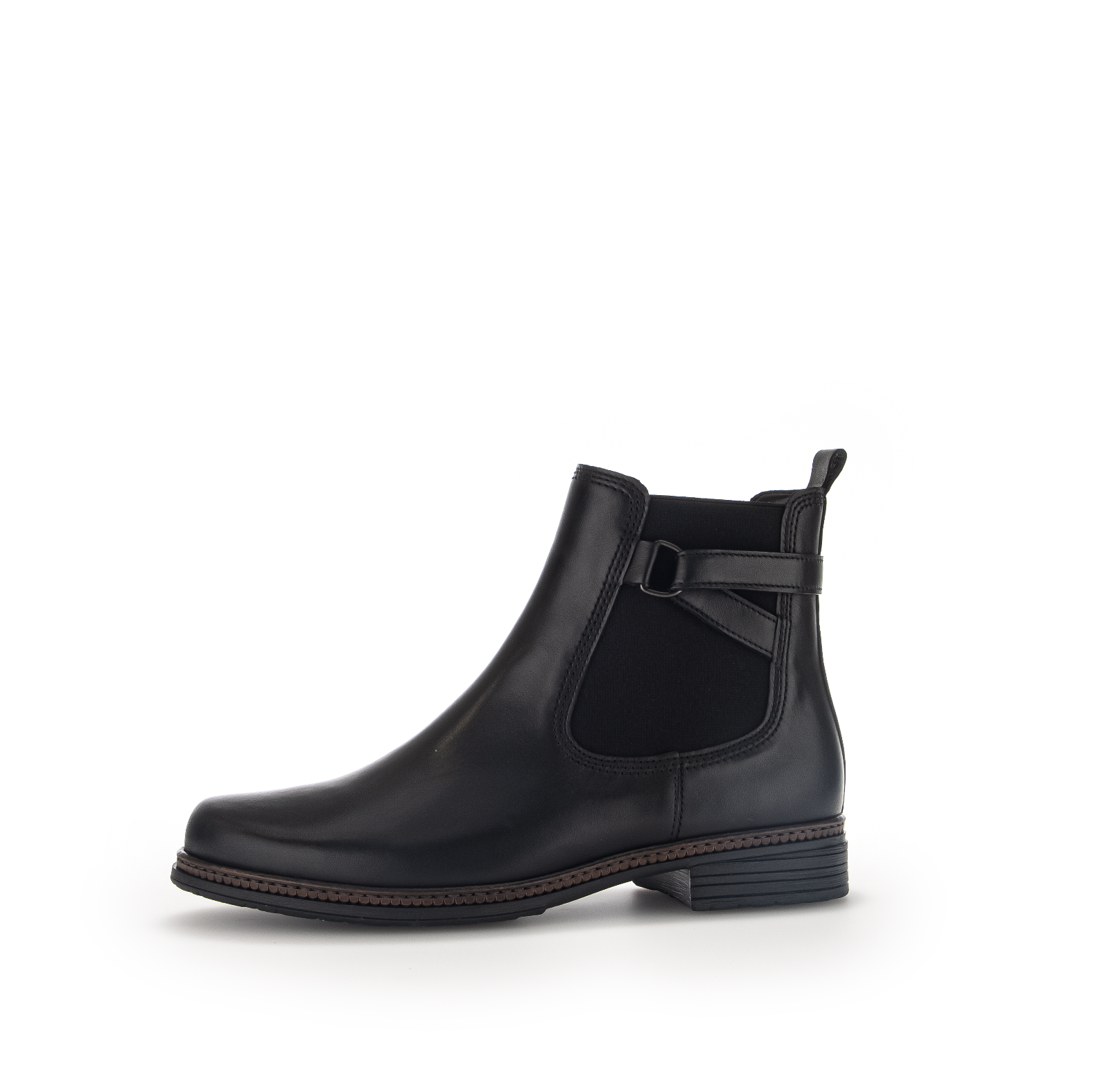 Håndlavet støvle, udført i sort lakeret skind med rund tå. Støvlen har elastiske sidepaneler og er dekoreret med en strop bagpå i sort præget skind med slangeskindsstruktur.