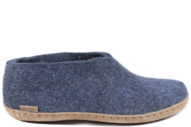 Filtsko af 100% ren naturlig uld i klassikerfarven denim med en sål af semi-vegetabilsk garvet kalveskind. Hjemmeskoens pasform følger fodens konturer og søger for, at den forbliver på foden. Skoen er smidig, og uldens egenskab til at optage fugt bevirker, at fødderne altid føles varme og tørre.