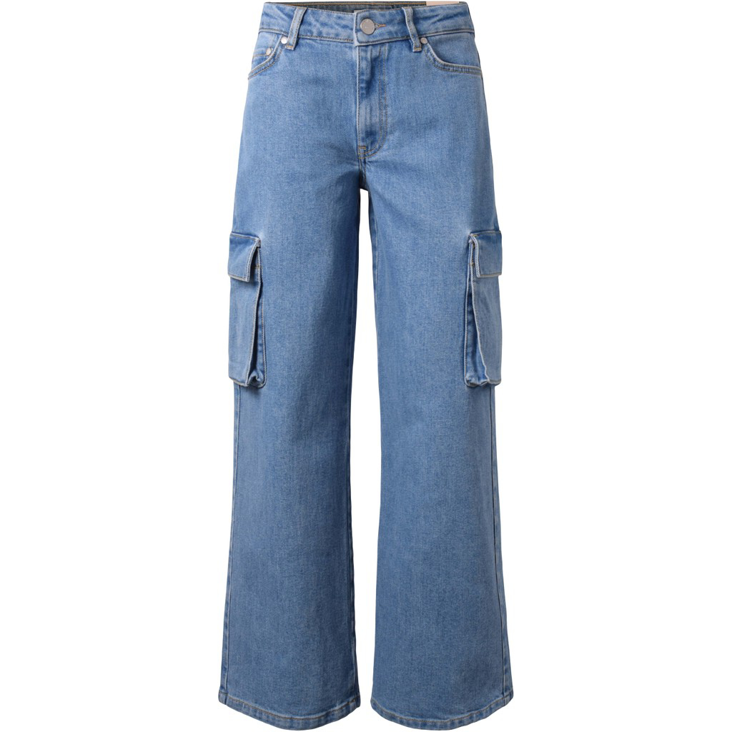 Denim bukser med stretch, vide ben, forlommer og baglommer samt cargo lommer. Bukserne har lynlås gylp og knap foran, og justerbar elastik i linningen.