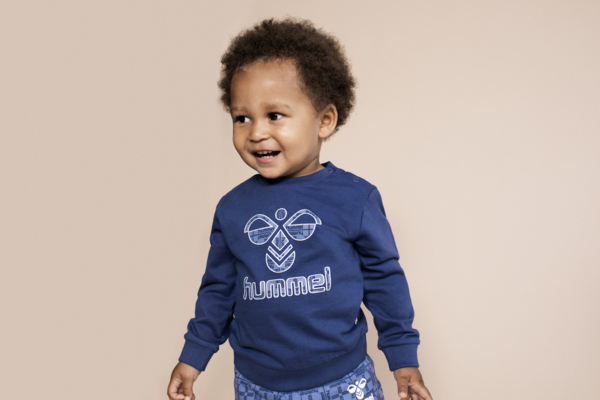 Super smart Hummel sweatshirt til dreng. Den er i mørkeblå, og på front er der et stort logoprint i blå nuancer. Den er med lange ærmer, brede kanter og den åbnes ved den venstre skulder med praktiske trykknapper.