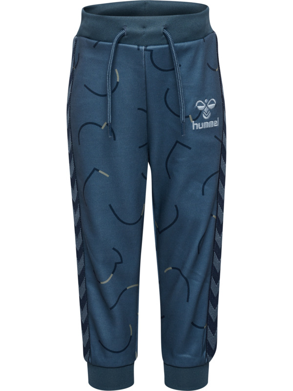 Super smarte Hummel sweatpants til dreng. De er i blå med lyseblå indsatser rundt om buksebenene. På front er der i venstre side trykt et hvidt Hummel-logo, og nederst på buksebenene er der hvide Hummel-logoer. De er med lange ben og brede ribkanter. I livet har de en justerbar elastikkant, som kan strammes yderligere ind med en snøre fortil.