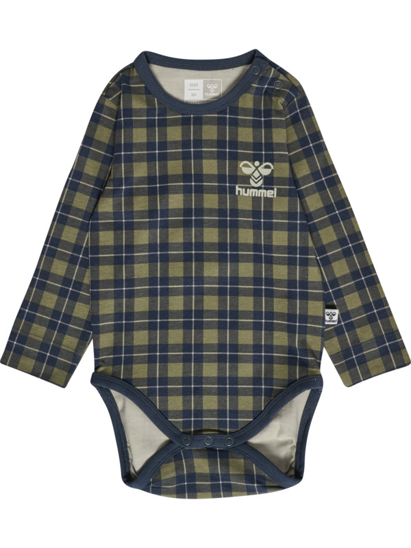 Lækker Hummel body til dreng. Den er i lysgrå med mørkblå og hvide nuancer på front. Den har lange ærmer, O-hals og praktiske trykknapper på den ene side og ved gylp.