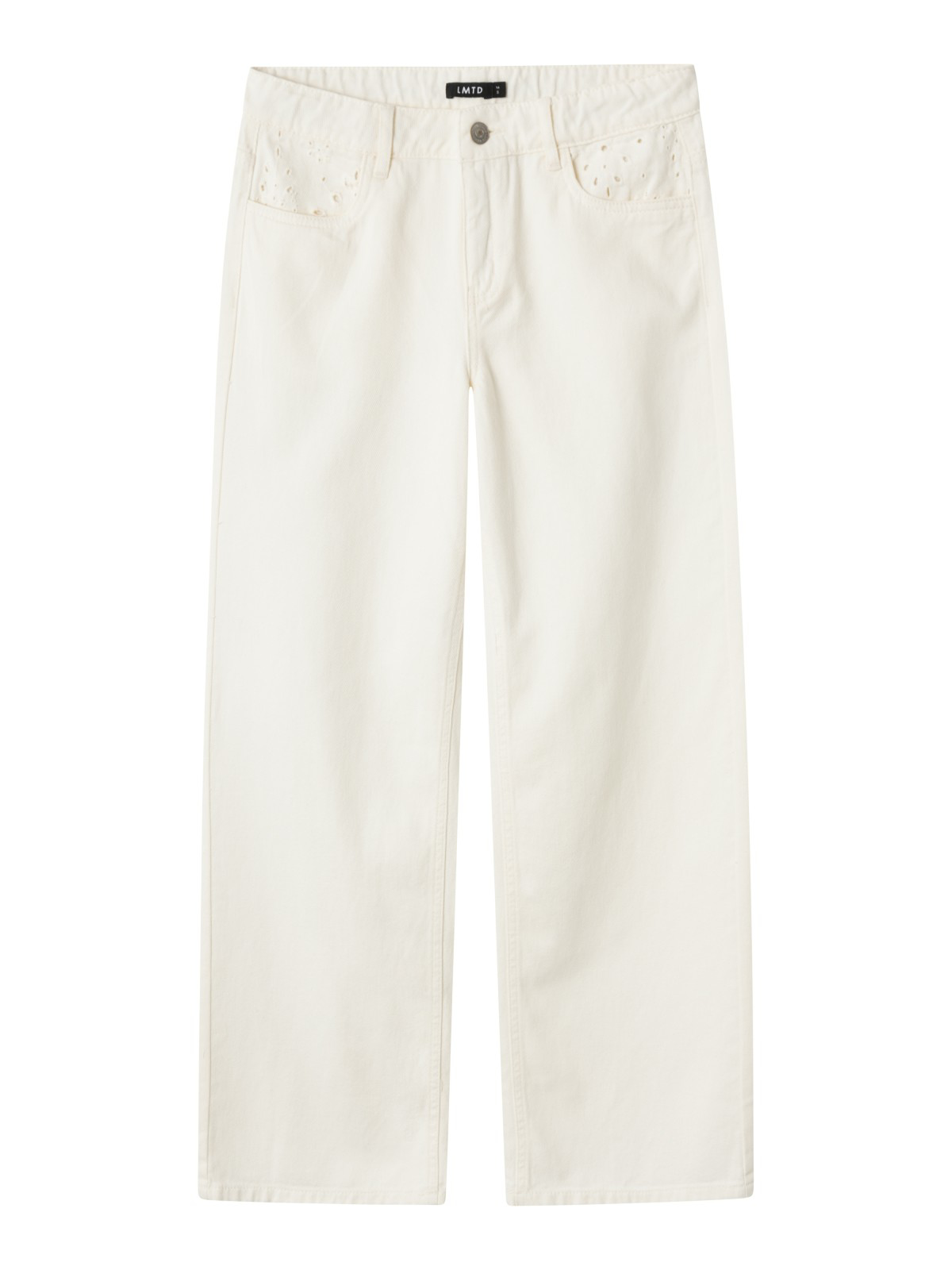 Denim jeans med stretch, vide ben, forlommer og baglommer. Lynlås gylp og knap foran, og justerbar elastik i linningen. Normal pasform, dog lidt lille i strørrelsen og vide ben med opbrat.