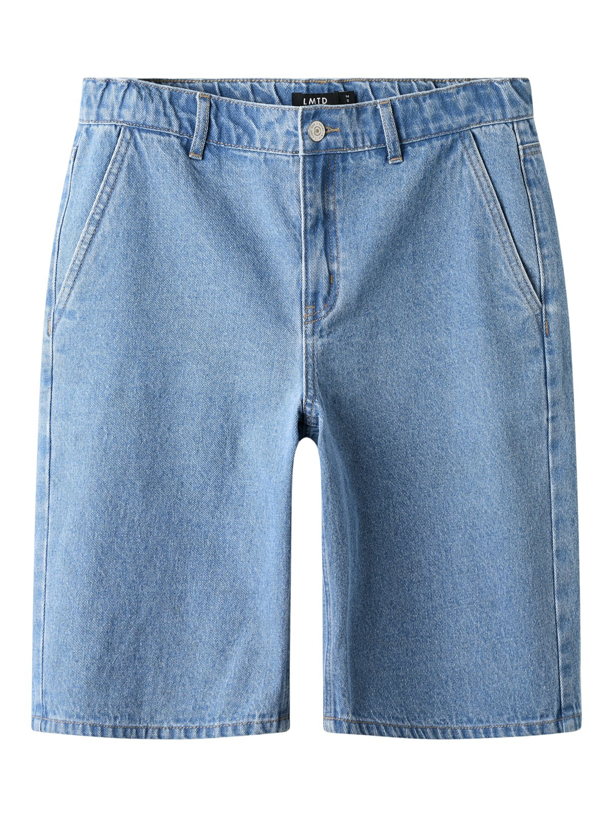 Denim jeans med stretch, vide ben, forlommer og baglommer. Lynlås gylp og knap foran, og justerbar elastik i linningen. Normal pasform, dog lidt lille i strørrelsen og vide ben med opbrat.