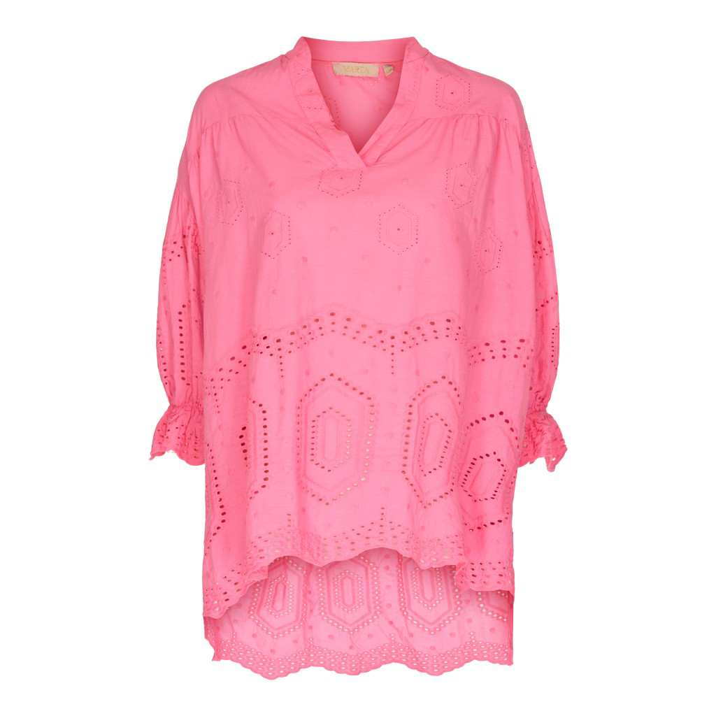 Sød og feminin Culture bluse med bindebånd foran. Blusen har 3/4 lange ærmer som afsluttes med en smal elastikkant. På fronten er en fin hul bort samt et broderet mønster.