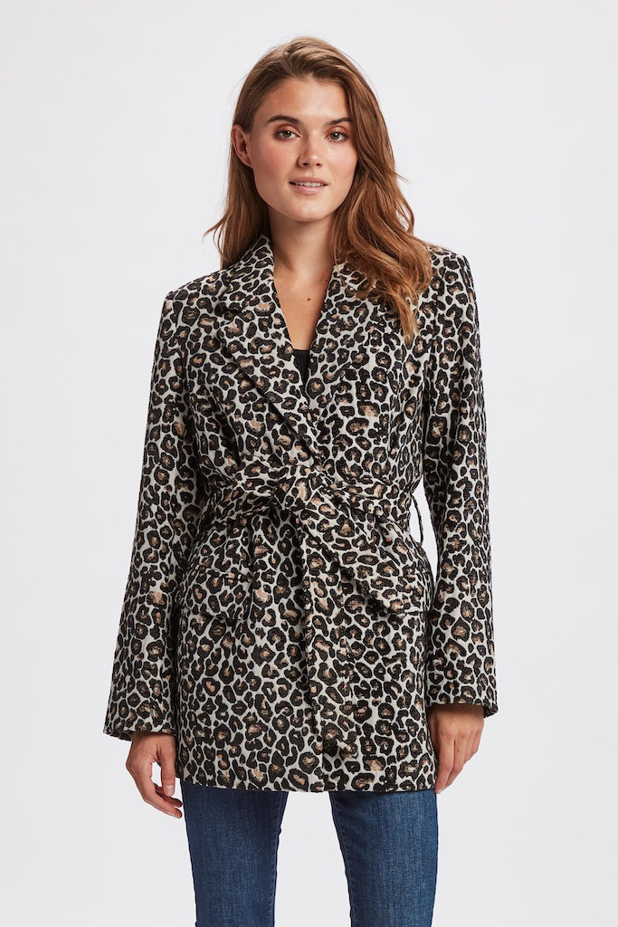 Super lækker denim jakke fra Nümph i et cool leopard print. Jakken er lidt kort og firkantet i modellen. Den har nedfalden krave og 2 store lommer foran, samt en fin læg detalje på ryggen. Knapper ned foran og på ærmets manchet.