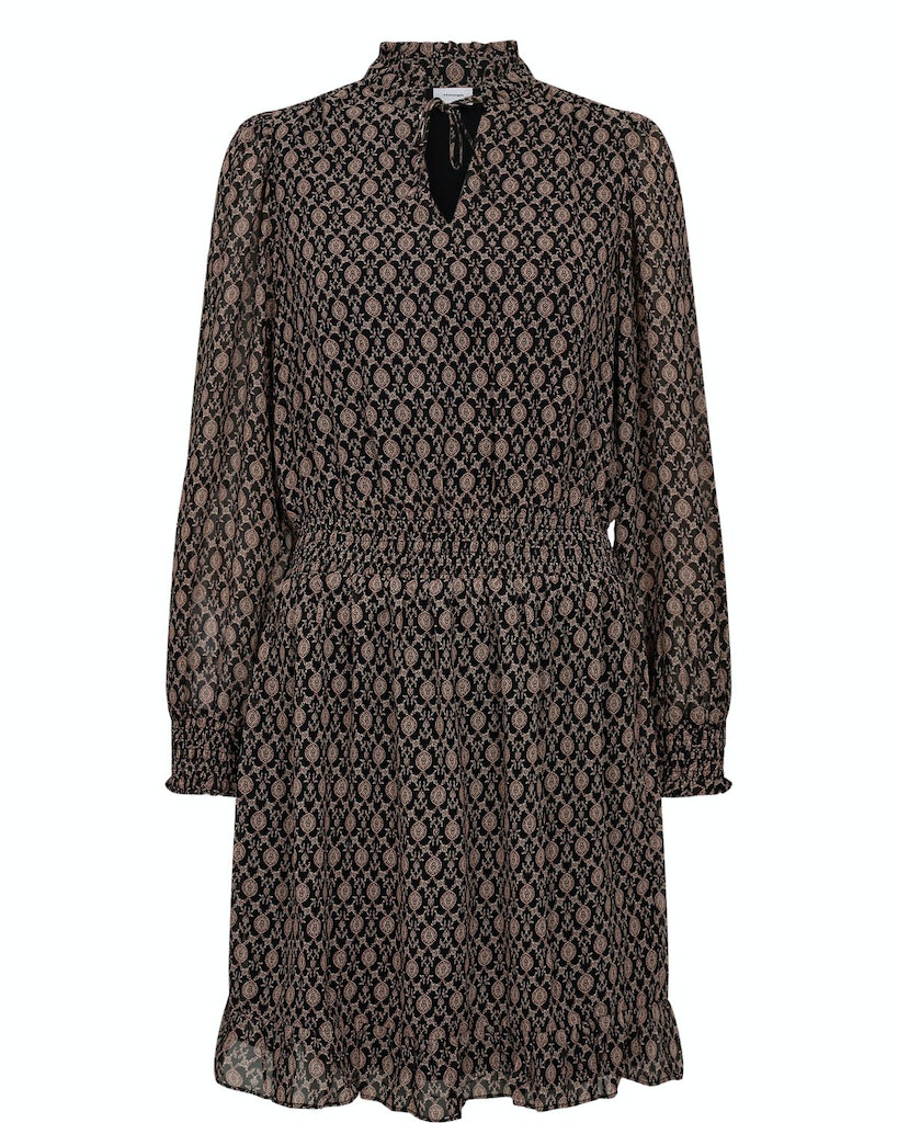 Smuk Culture kjole med et flot sort blad print. Kjolen har et løst flatterende ærme, en fin v-udskæring og lommer i siden. Den har en begalig pasform og er knælang.