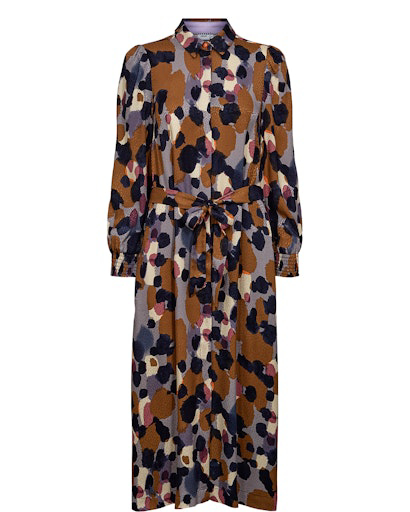 Lækker Nümph skjortekjole i den smukkeste metervarer. Kjolen har et super flot farevmix som passer perfekt til efteråret. Viskose kvaliteten har et let shine som giver farver og mønster lidt ekstra. Der er lange ærmer med smockkant, skjortekrave og skjult knaplukning ned foran. I halsen lukkes kjolen med en fin orange knap der matcher ind i farverne. Der medfølger bindebælte til taljen.