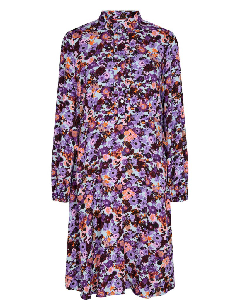 Super flot viskose kjole fra Culture. kjolen har et flot livlivt print i friske luse farver. Der en flot v-udskæring og ballonærmer hvor der på ærmekanten er en bred smock. Kjolen har lommer i siden.Bluse findes i samme oprint og farve