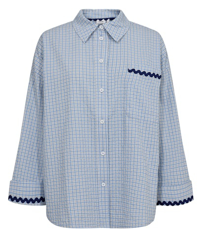 Super flot skjorte fra Culture med klassiske hvide striber og krave. Skjorten har lidt længde med slidser i siden og flot afrundet kant nederst. De påsatte bloster giver skjorten et feminnt touch.