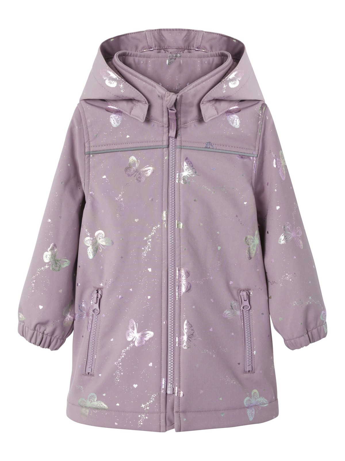 Rigtig smuk softshelljakke fra name it med sommerfugle print. Jakken har en vandtæthed på 8000mm, åndbarhed på 3000g/m2/24t og en slidstyrke på 20.000 Martindale. Dertil er jakken vindtæt og har membran som et ekstra lag mellem foring og skalstof for en komplet vandtæt beskyttelse.