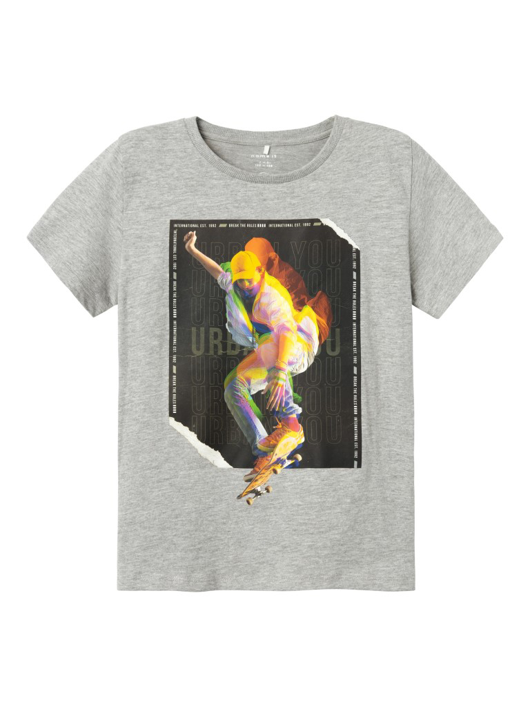 Super fin Hummel T-shirt til dreng i hvid med forskellige farver Hummel logo print over det hele. Den har korte ærmer og rib O-hals. Style den med et par fede jeans til.