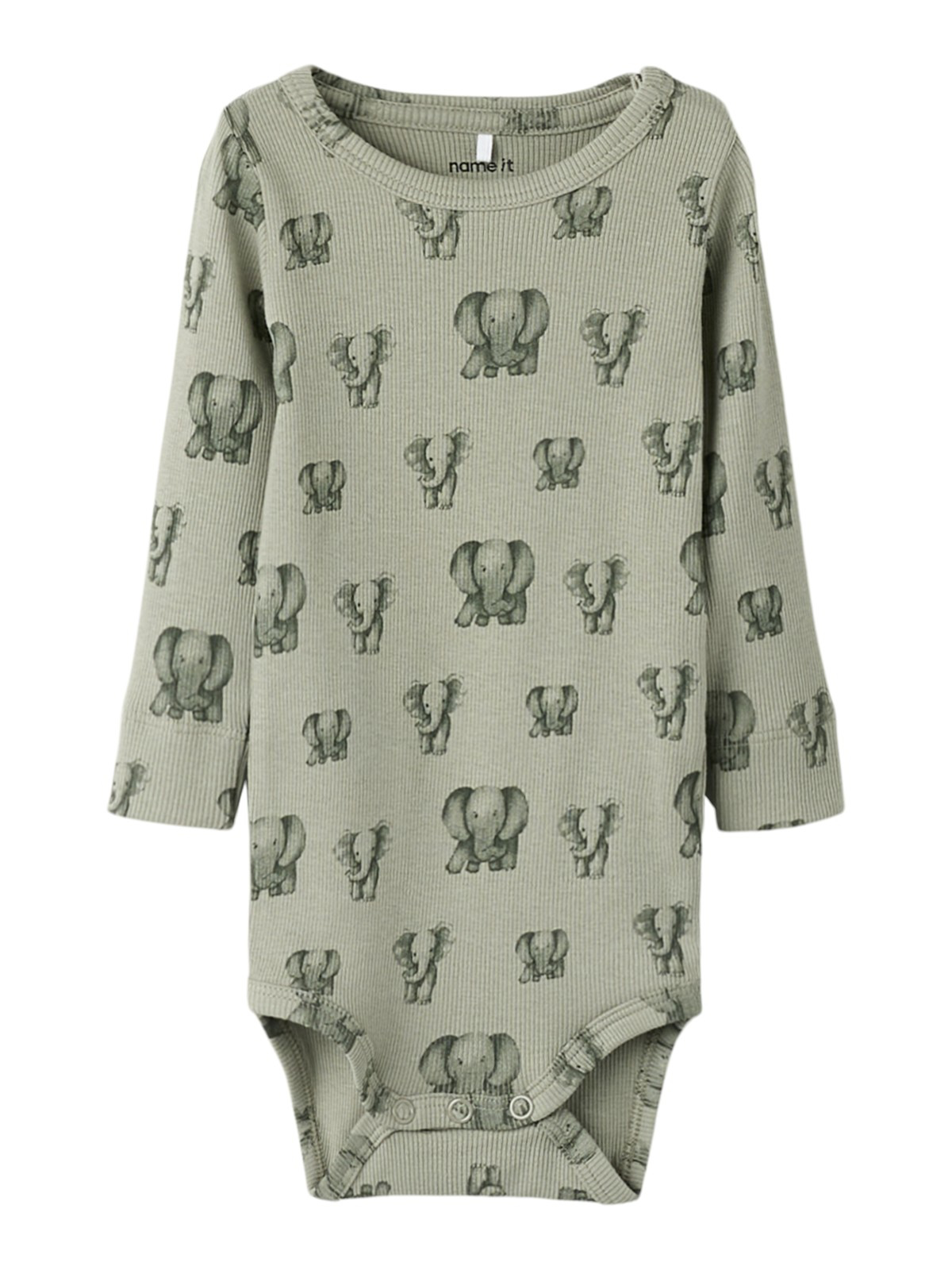 Lækker Hummel Body til dreng i en olivengrøn. Den har lange ærmer og praktiske trykknapper ved skulder og gylp.