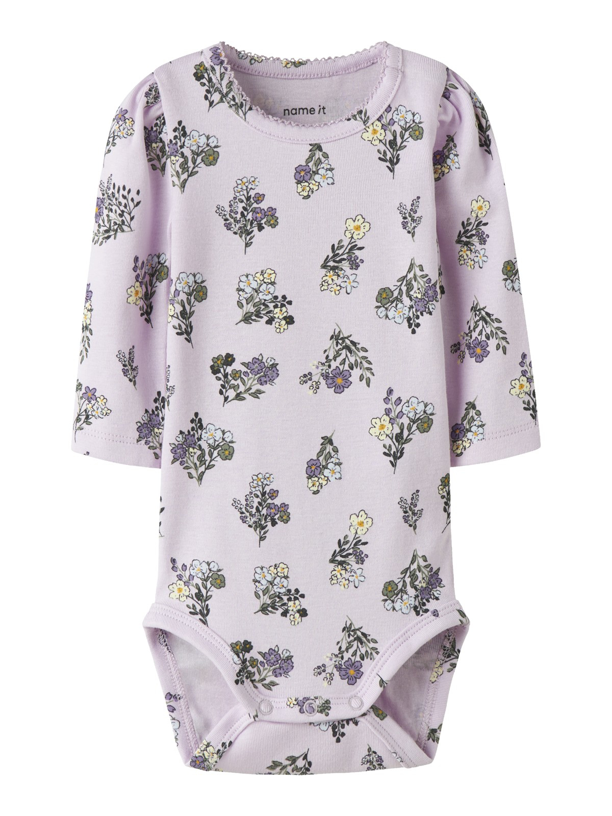 Super sød Hummel body i rosa eller grøn. Foran er der print med logo. Bodyen har lange ærmer med flæser, og den har praktiske trykknapper på venstre skulder og mellem benene.