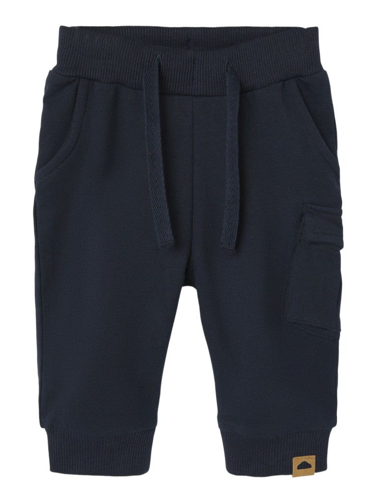 Mega cool Hummel bukser til dreng. De er i mørkeblå, hvor det nederste af buksebenene er brune. De er med lange ben og brede kanter. I livet har de en justerbar elastikkant, som kan strammes yderligere ind med en snøre fortil.