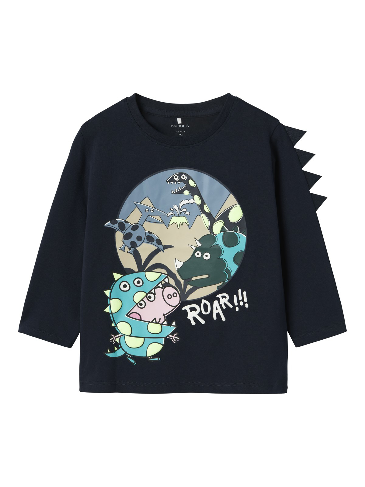 Super smart Hummel sweatshirt til dreng. Den er i mørkeblå, og på front er der et stort logoprint i blå nuancer. Den er med lange ærmer, brede kanter og den åbnes ved den venstre skulder med praktiske trykknapper.