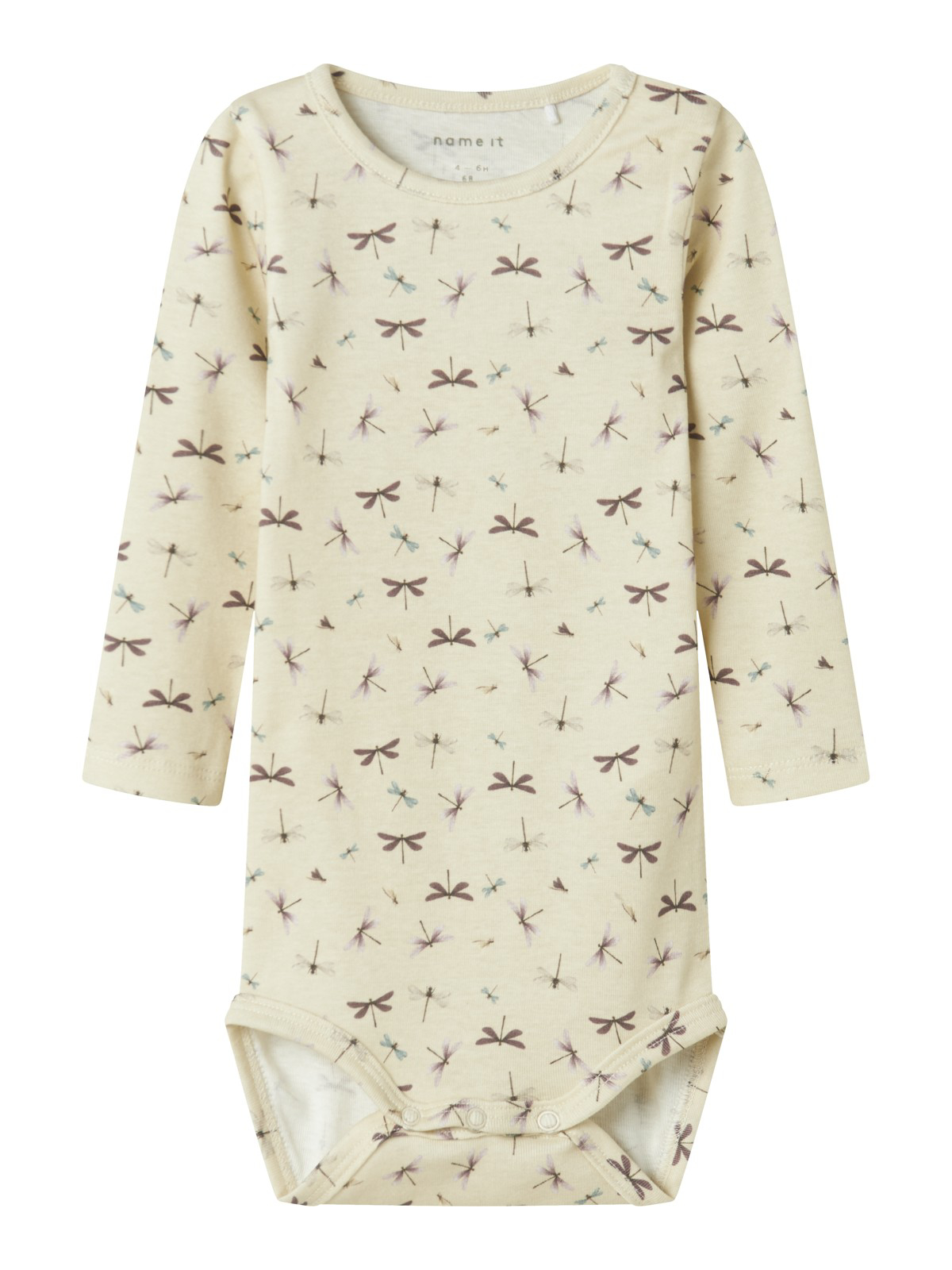 Sød Hummel Body fra Hummel til pige i råhvid med små Hummel logoer i forskellige farver over det hele. Den har praktiske trykknapper ved skulder og gylp.