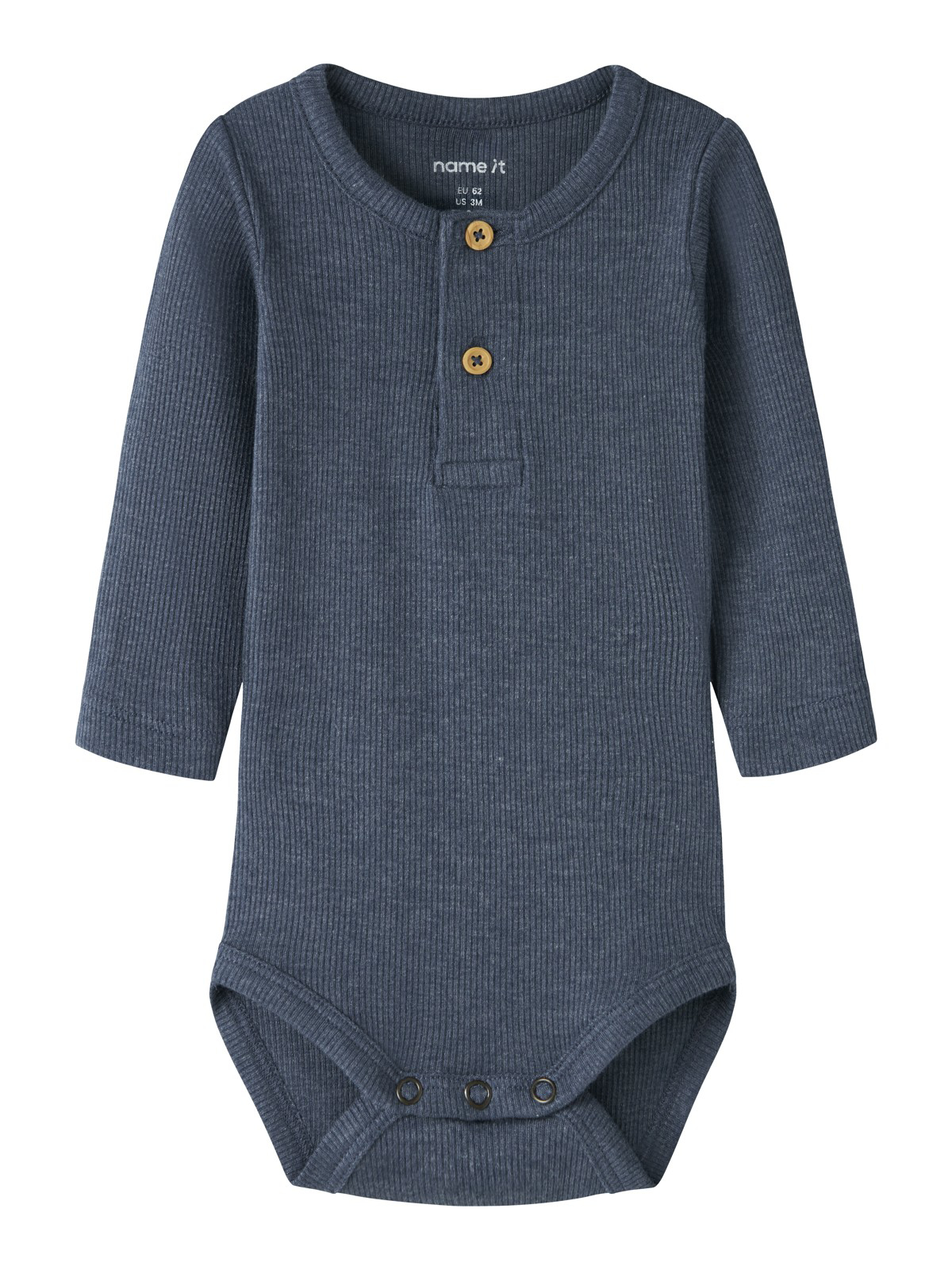 Super fin Hummel body til dreng i blå, og til pige i lyserød. Den er med lange ærmer, O-hals og med logo på front. Den har praktiske trykknapper på højre skulder og mellem benene.