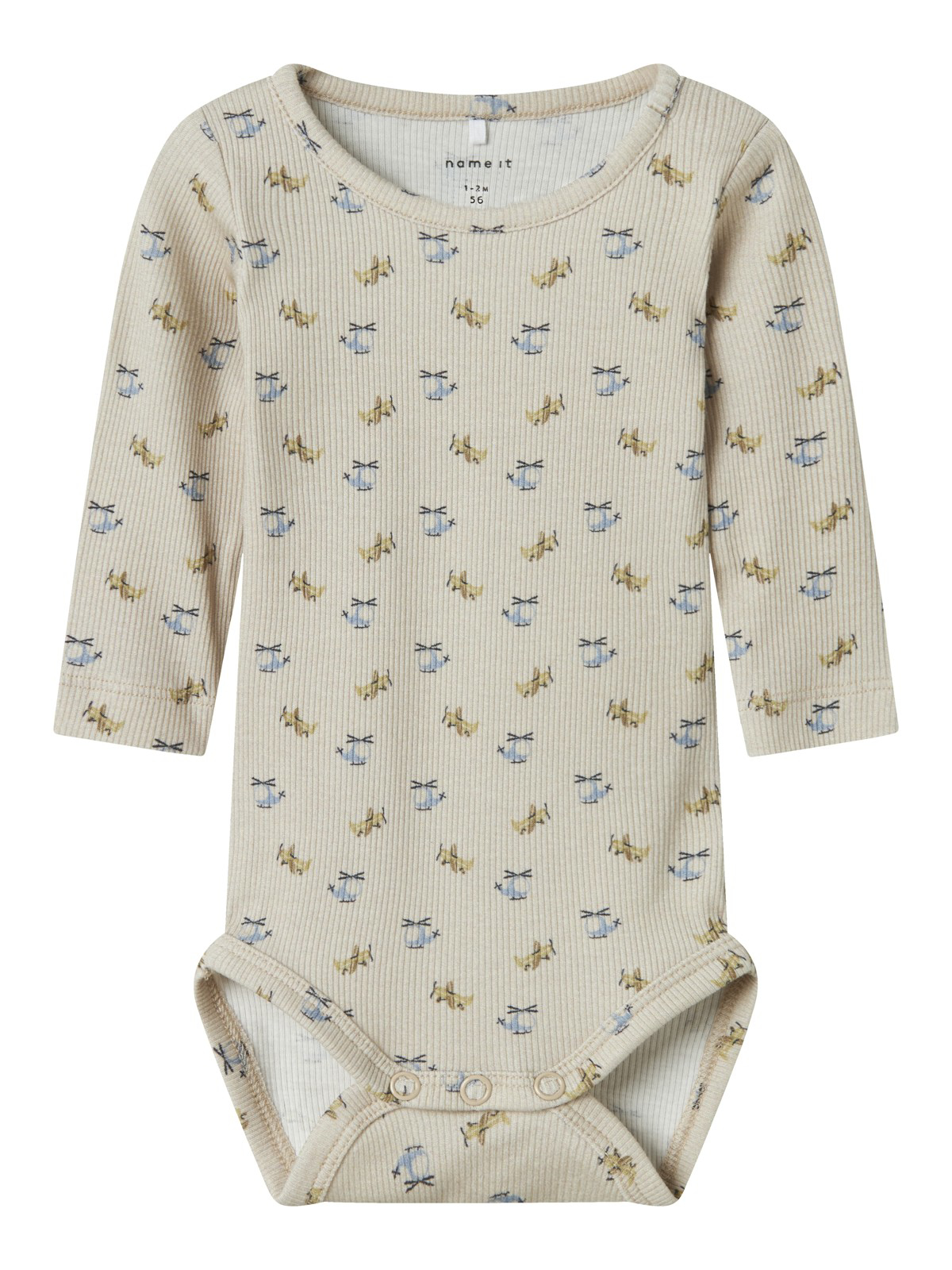Lækker Hummel body til dreng. Den er i lysgrå med mørkblå og hvide nuancer på front. Den har lange ærmer, O-hals og praktiske trykknapper på den ene side og ved gylp.