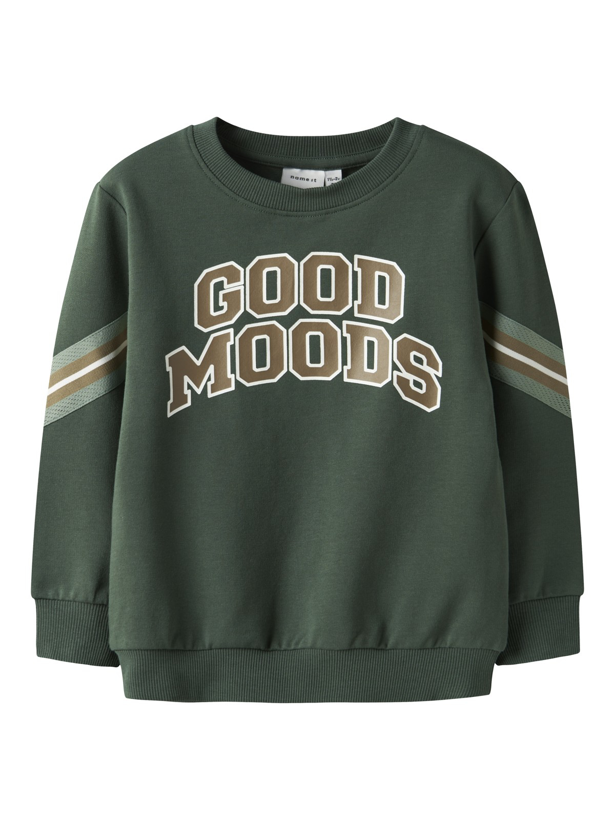 Super smart Hummel sweatshirt til dreng. Den er i mørkeblå, og på front er der et stort logoprint i blå nuancer. Den er med lange ærmer, brede kanter og den åbnes ved den venstre skulder med praktiske trykknapper.