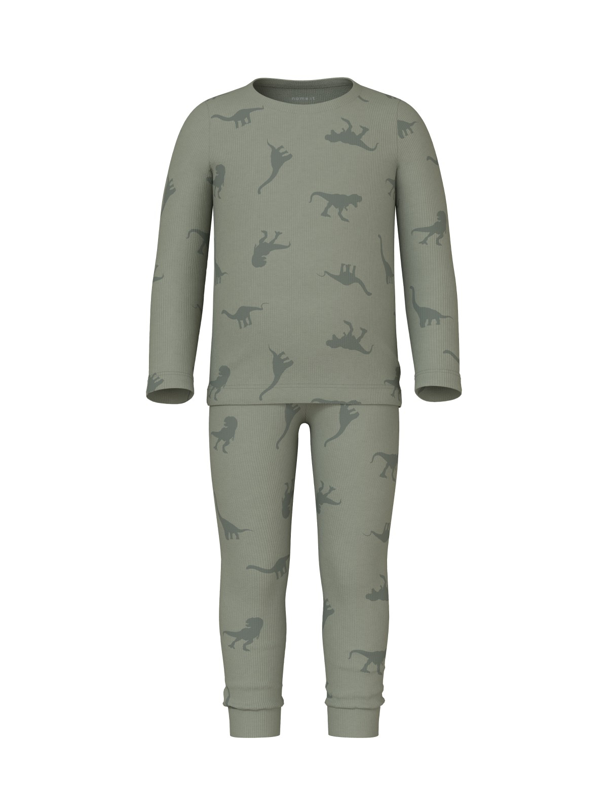 Blødt Joha nattøj i to dele, der består af en natbluse og et par natbukser. Natblusen er i råhvid med allover print. Natbukserne er i ensfarvet oliven. Natblusen har en rund hals med en smal, oliven ribkant, og den har lange ærmer med brede, oliven elstikkanter. Natbukserne har en smal elastikkant i livet, og buksebenene har brede ribkanter.