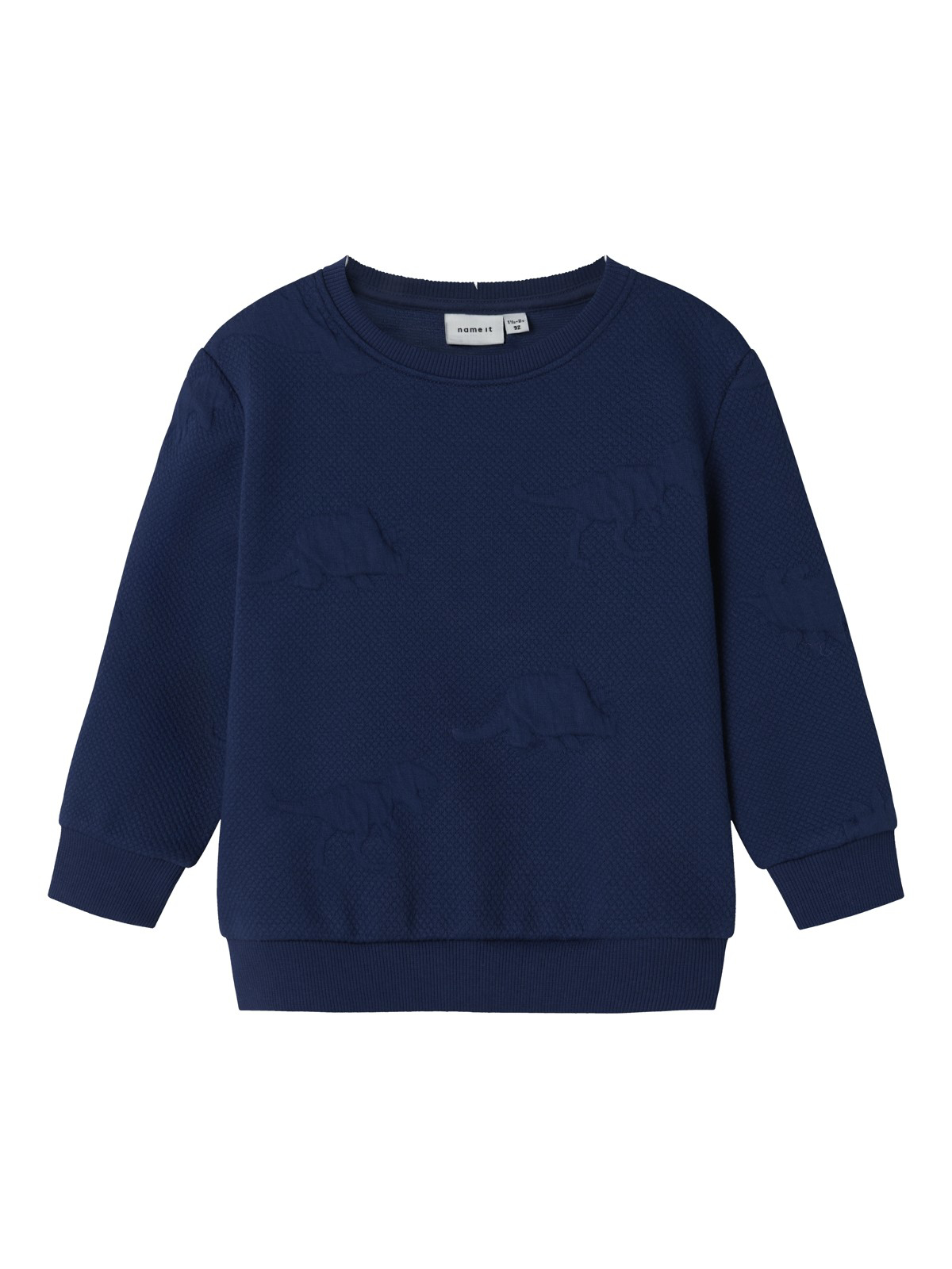 Super smart Hummel sweatshirt til dreng. Den er i mørkeblå, og på front er der et stort logoprint i blå nuancer. Den er med lange ærmer, brede kanter og den åbnes ved den venstre skulder med praktiske trykknapper.