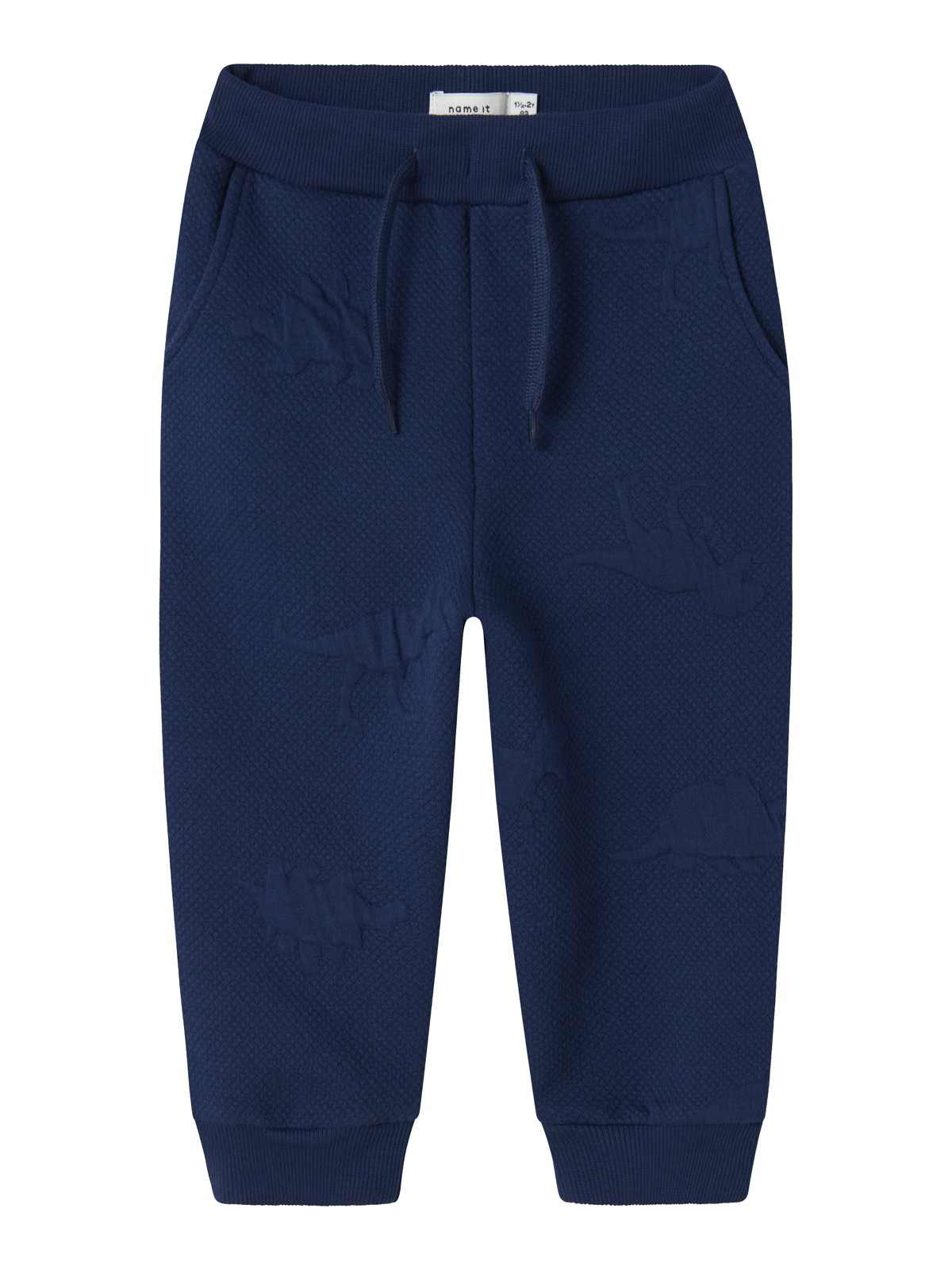 Mega cool Hummel bukser til dreng. De er i mørkeblå, hvor det nederste af buksebenene er brune. De er med lange ben og brede kanter. I livet har de en justerbar elastikkant, som kan strammes yderligere ind med en snøre fortil.
