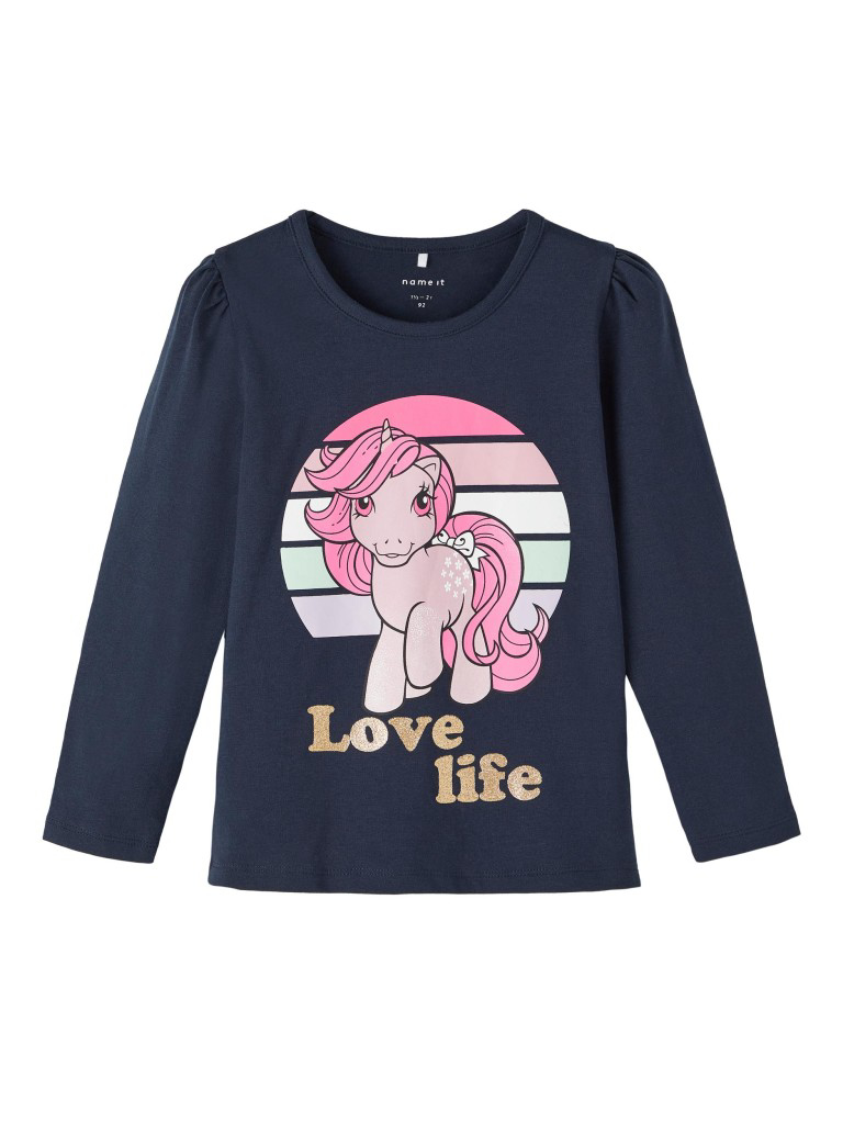 Super smart og blød sweatshirt til pige med fine heste print over det hele. Sweaten er i en lys lilla med grå heste, og den har O-rib hals og lange ærmer. Perfekt til dagpleje og børnehave.
