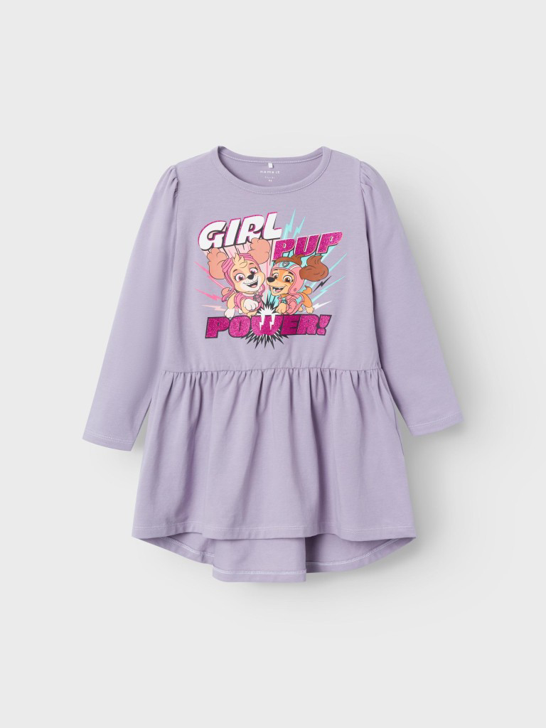Super lækker Hummel kjole i lys lavendel med glimmer. Kjolen har søde flæser på front og kan knappes halvt ned. Der er elastik på ærmerne og guld logo på front.