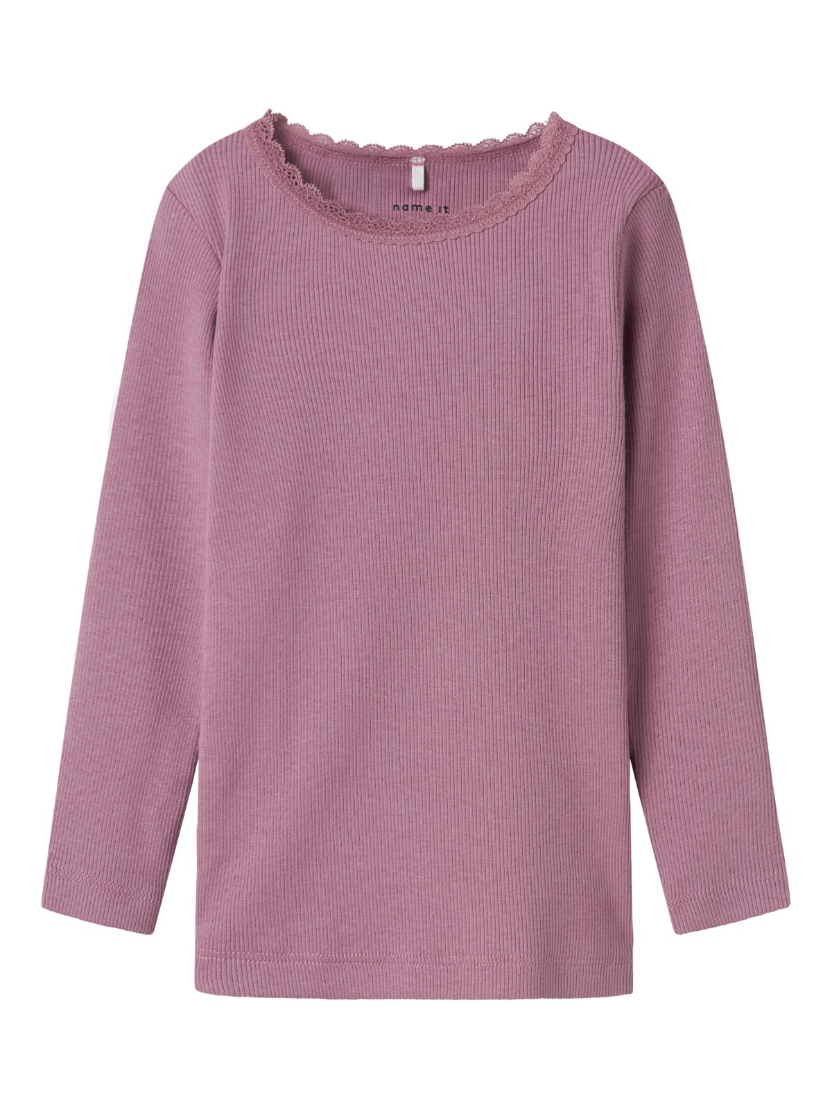 Super slim fit top fra name it med blondedetalje ved halsen. Toppen har lange ærmer og O-hals.