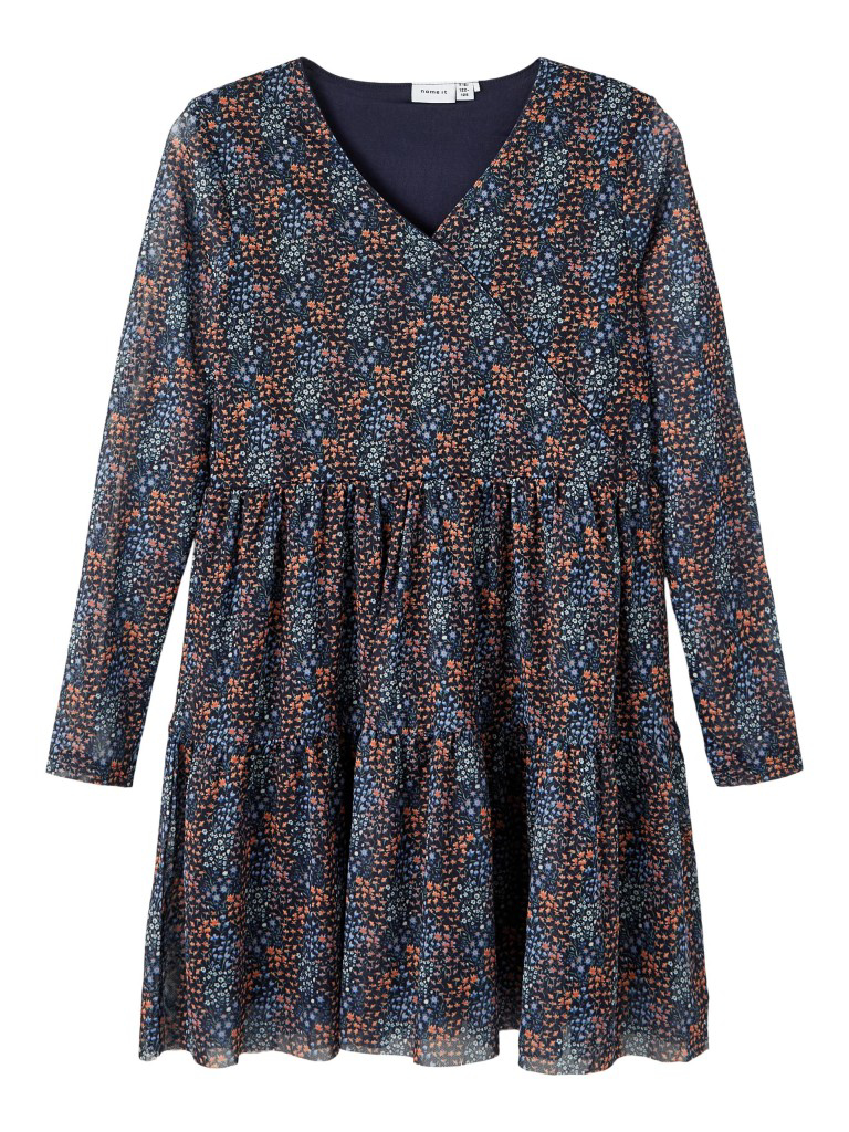 Den fineste kjole fra Name It med blomsterprint. Kjolen har V-hals og lange ærmer, som gør den elegant. Dertil er den i det smukkeste mesh matriale.