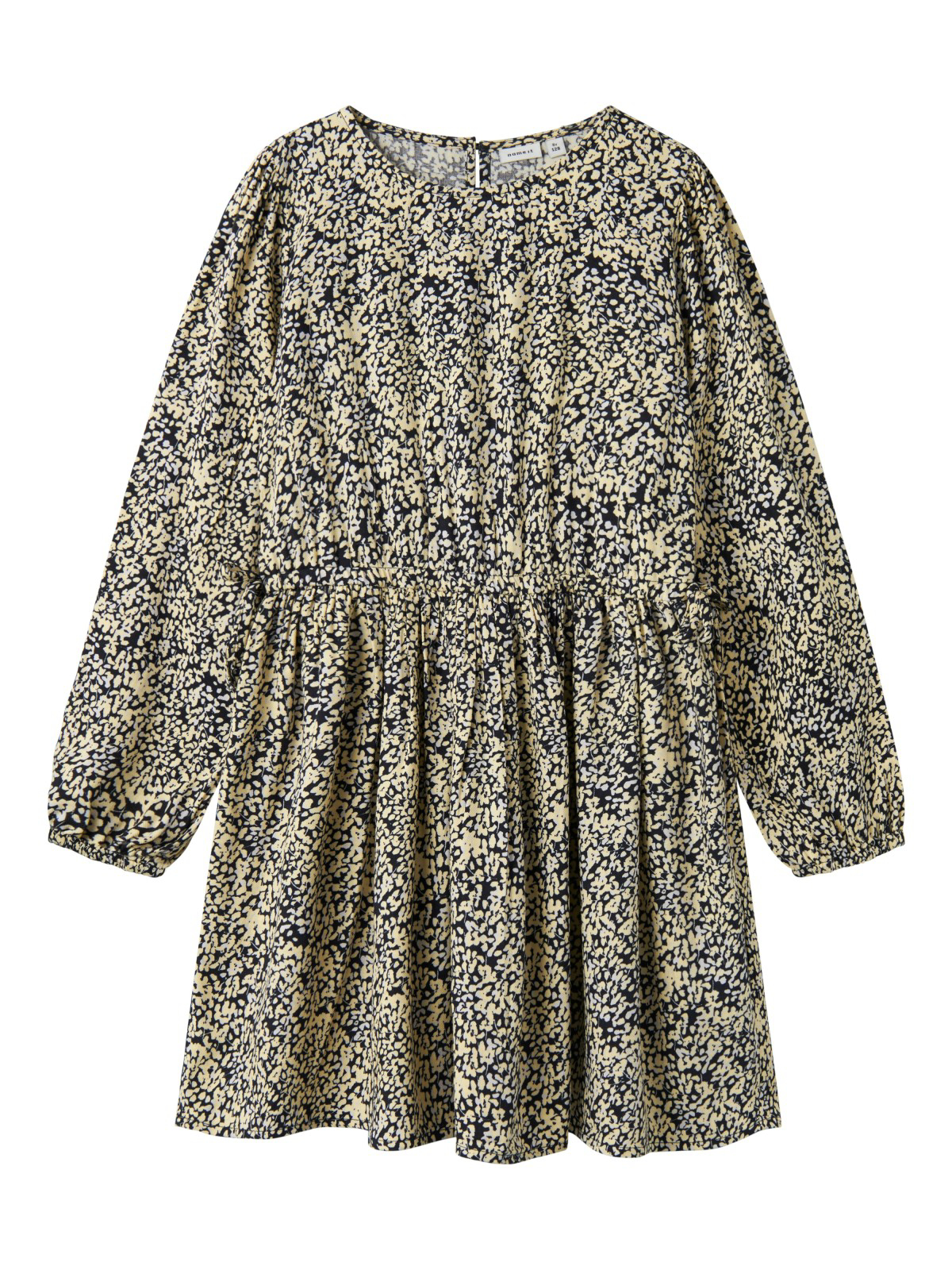 Super smuk kjole fra Name It i beige med fint blomsterprint over det hele. Kjolen har elastiske manchetter, knap og løkkelukning bagpå og er lav i taljen.