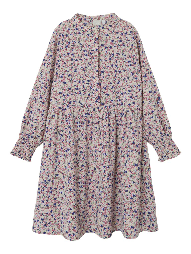 Super smuk kjole fra Name It i beige med fint blomsterprint over det hele. Kjolen har elastiske manchetter, knap og løkkelukning bagpå og er lav i taljen.