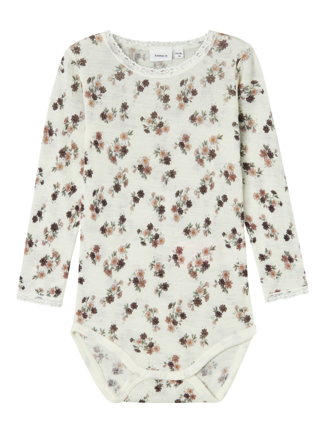 Sød Hummel Body fra Hummel til pige i råhvid med små Hummel logoer i forskellige farver over det hele. Den har praktiske trykknapper ved skulder og gylp.