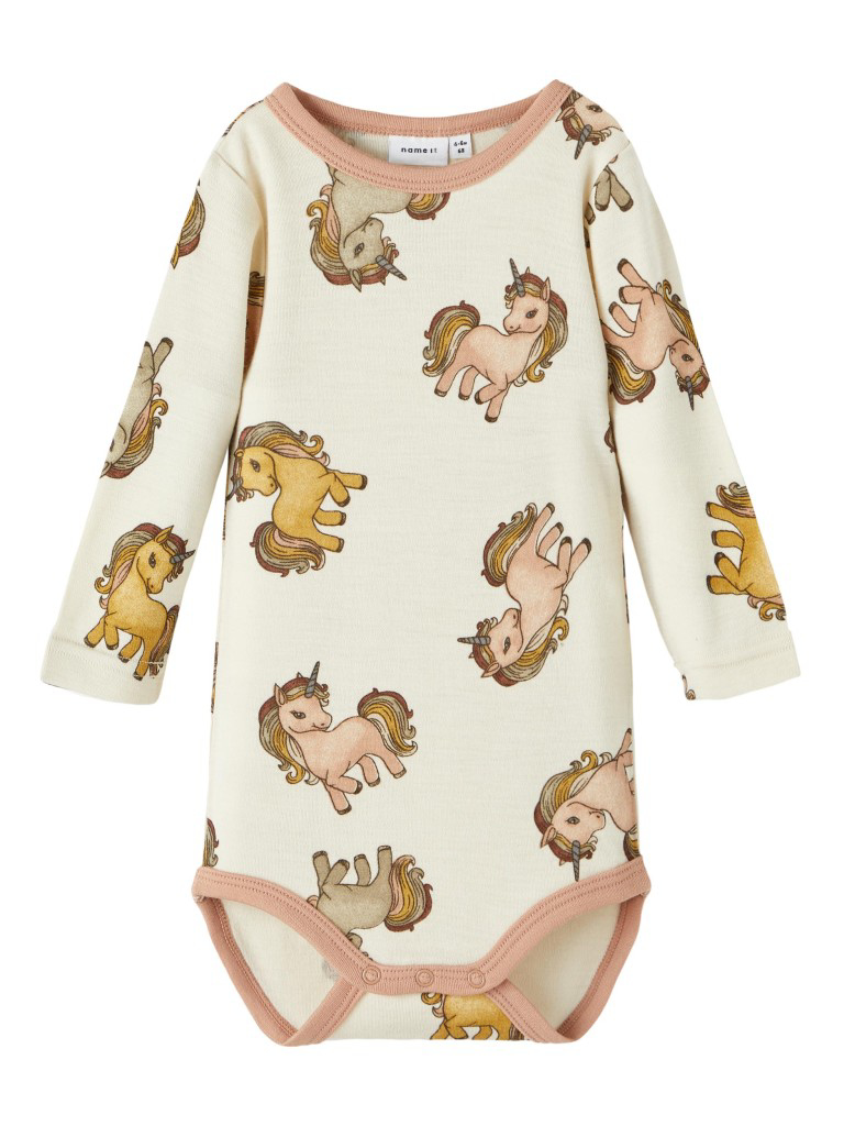 Sød Hummel Body fra Hummel til pige i råhvid med små Hummel logoer i forskellige farver over det hele. Den har praktiske trykknapper ved skulder og gylp.