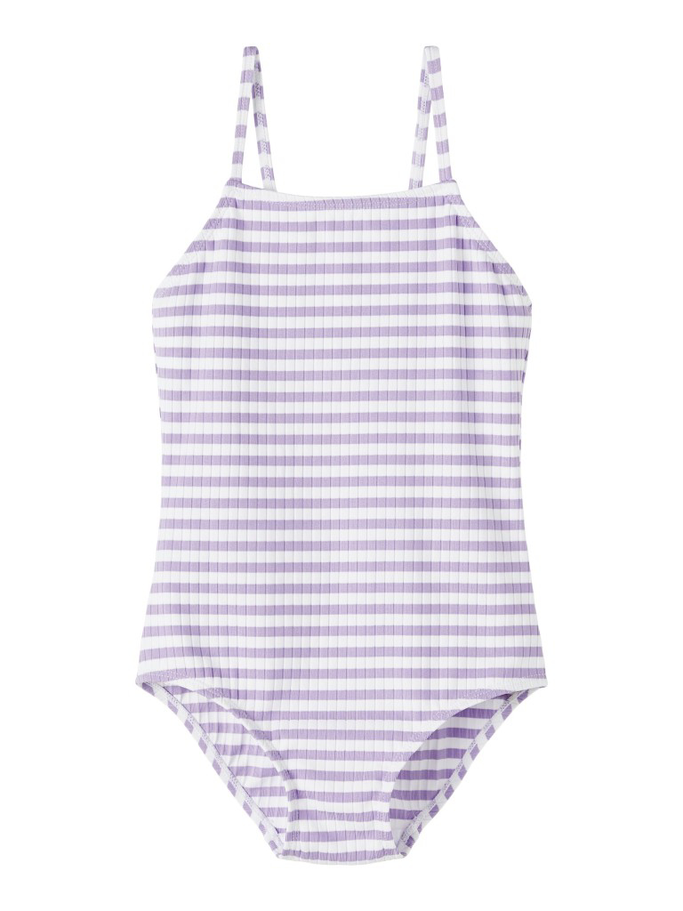 Super fin badedragt fra Name It i stribet lilla/hvid. Den har justerbare stropper.