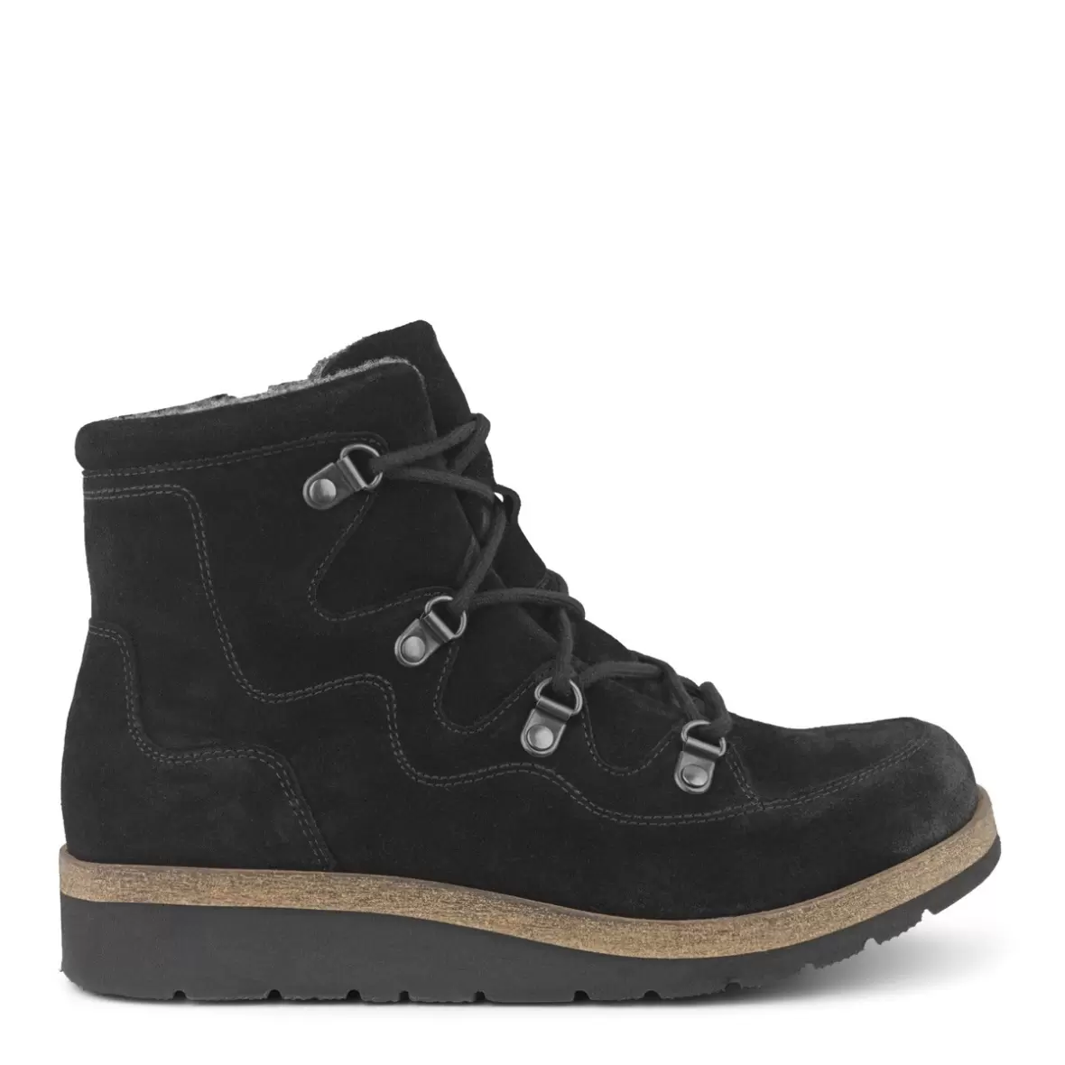 Pæn sort støvle fra New Feet lavet i sort hydro ruskind med snørelukning over vristen og lynlås på indersiden af skaftet. Støvlen er varm isolerende og sikre tørre fødder. Ydersålen der har en let gængeeffekt er lavet i EVA.