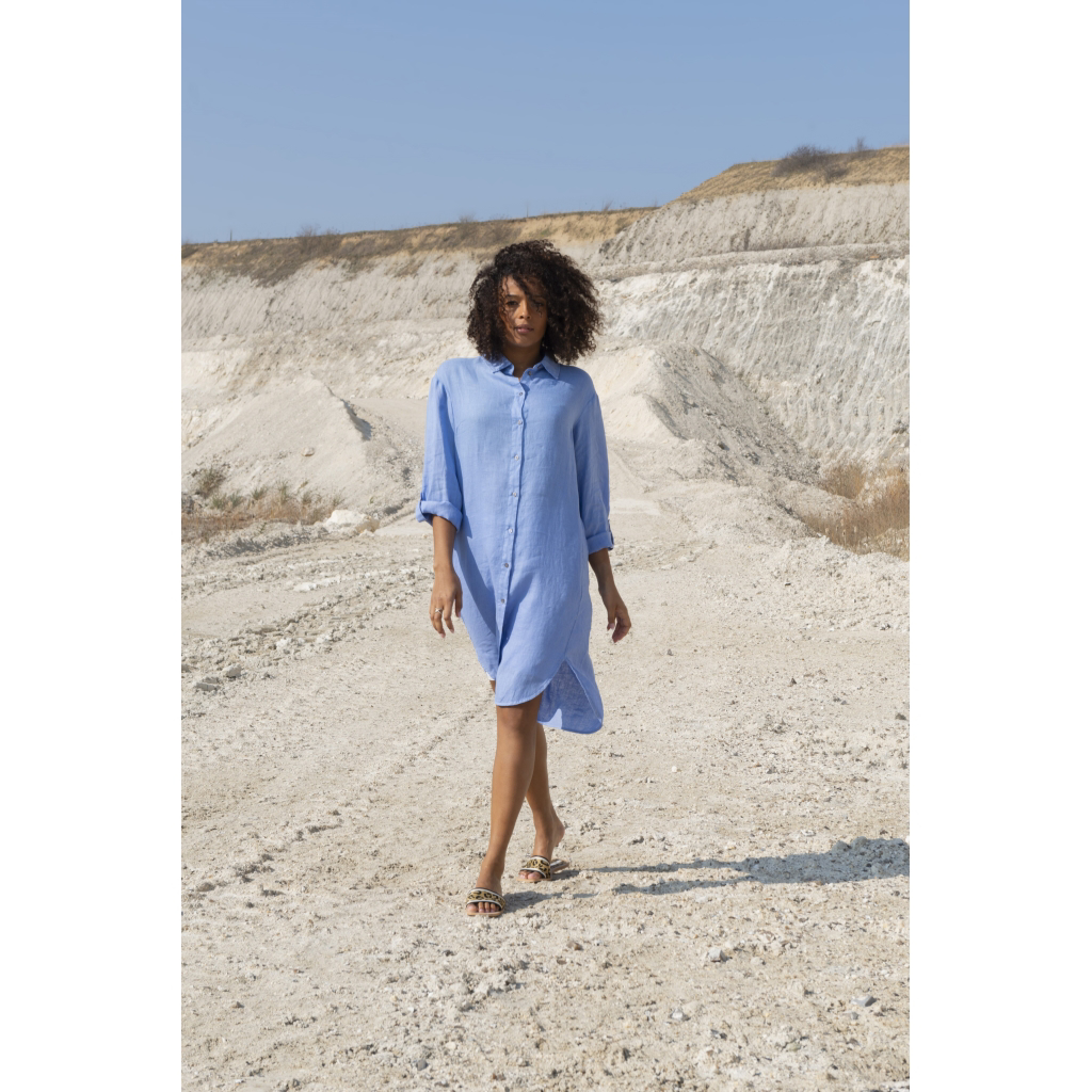 Elegant Marta kjole med et flot feminint print. Kjolen har kinakrave, stolpelukning og 3/4 lange ærmer. Den er lige op og ned i modellen med fin plads.