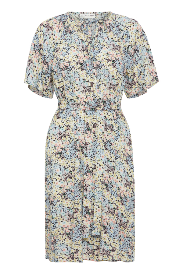 Smuk og elegant kjole fra Pulz Jeans i et flaterende snit. Kjolen har et super flot mønster med en diskret glimmertråd. Kjolen har rund hals, lynes i nakken og har insyet underkjole i viskose. Ærmerne er lange og har en bred manchet.