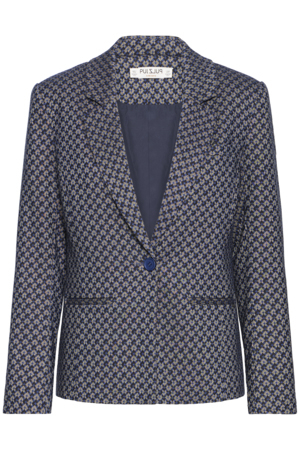 Elegant Cally blazer fra Pulz Jeans i en dyb mørkblå farve. Den har et regular fit som giver en flatterende facon og fortabel pasform. Blazeren lukkes med en enkelt knap, har reverse og foer.