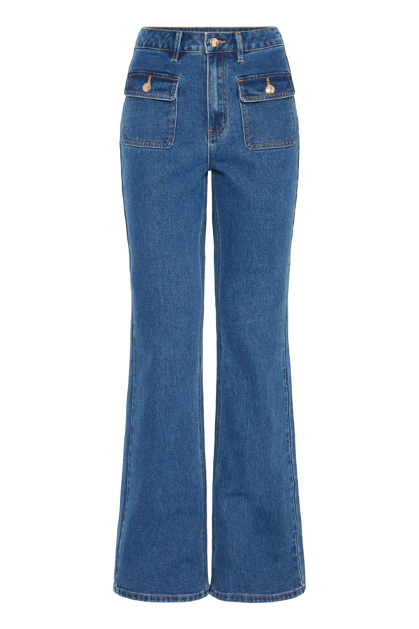 Smarte denim bukser i den blødsete kvalitet. Buksen er fra Nümph og har en høj talje med vidde i benene. Der er skrå sidelommer og paspolrede baglommer. De er meget stretchy og bløde som giver en god komfort og pasform.