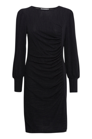 Smuk kjole fra Pulz Jeans med en super god pasform. Kjolen er sort med sort glimmer effekt. Den har lange ærmer med en bred manche, rund hals udskæring og let puf på skulderen samt fin rynkeeffekt foran i den ene side.