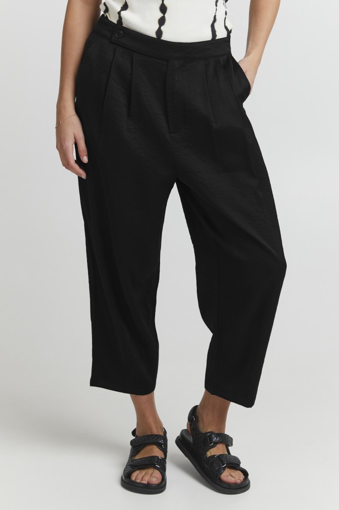 Lækre sorte bukser fra Bessie Jeans i model Fresh. Fresh har 7/8 ben længde og skrå lommer. Bagpå er der almindelige baglommer. Kvaliteten er blød, stretchy, satin agtig og lidt let i det.